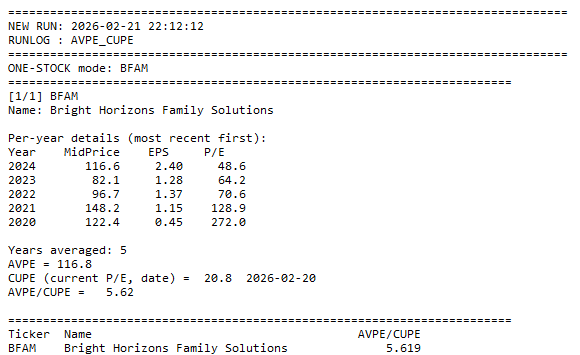 Summary (sorted by AVPE/CUPE, desc): Ticker Name AVPE/CUPE AMCX AMC Networks 12.137 BFAM Bright Horizons Family Solutions 5.721 BP BP 5.406 ZM Zoom Communications 4.948 VOD Vodafone Group 2.919 ADBE Adobe 2.629 FOUR Shift4 Payments 1.572 ZBH Zimmer Biomet Holdings 1.462 AXTA Axalta Coating Systems 1.222 CENTA Central Garden & Pet 1.156 WDFC WD-40 1.150 HLX Helix Energy Solutions 1.048 PLTR Palantir Technologies 0.978 LVS Las Vegas Sands 0.871 TMHC Taylor Morrison Home 0.830 AVGO Broadcom 0.793 CELH Celsius Holdings 0.772 JBHT J.B Hunt Transport Services 0.695 KEYS Keysight Technologies 0.673 CHEF Chefs' Warehouse 0.620 EPD Enterprise Products Partners 0.603 TT Trane Technologies 0.577 KKR KKR 0.570 LHX L3Harris Technologies Inc 0.567 CCB Coastal Financial 0.566 VRT Vertiv Holdings 0.483 BG Bunge Global SA 0.425 LEU Centrus Energy 0.334 CAT Caterpillar 0.298 MPAA Motorcar Parts Of America 0.200 INTC Intel 0.009 SNOW Snowflake 0.000 PCVX Vaxcyte 0.000This is useful in relating recent performance to past valuation.
