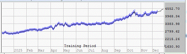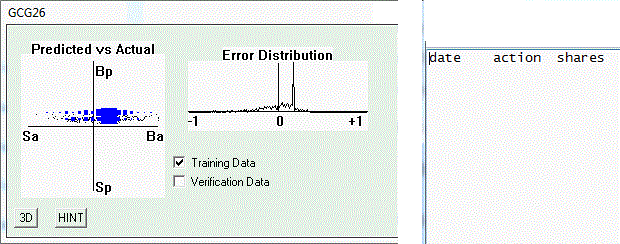 The way this is supposed to work is the height of the bars indicates confidence level in predictions based upon data fed into a neural network. These bars are very short consistently suggesting a very low confidence level in making any trade. What we see here is no trades completed trades made here starting out long for maximum profit potential, as gold is caught in a straight up long trend where any sales would have generated likely losses. This seems to be a strictly "buy and hold" situation where no previous repeatable sales data would help the system decide upon a sale point. While a crash is extemely likely at some point after metals rally like this, the only recommendation seem to be to maintain tight stops and hope they don't get run by market makers.