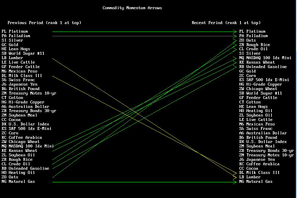 These are the popular commodities we try to follow. The "arrow chart" below attempts to draw attention to commodities which have had significant