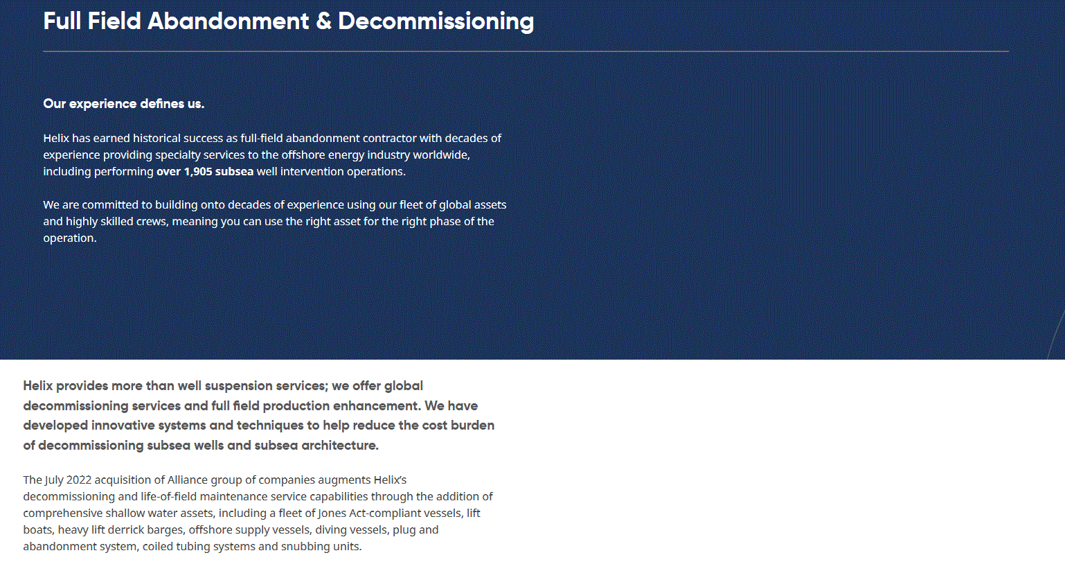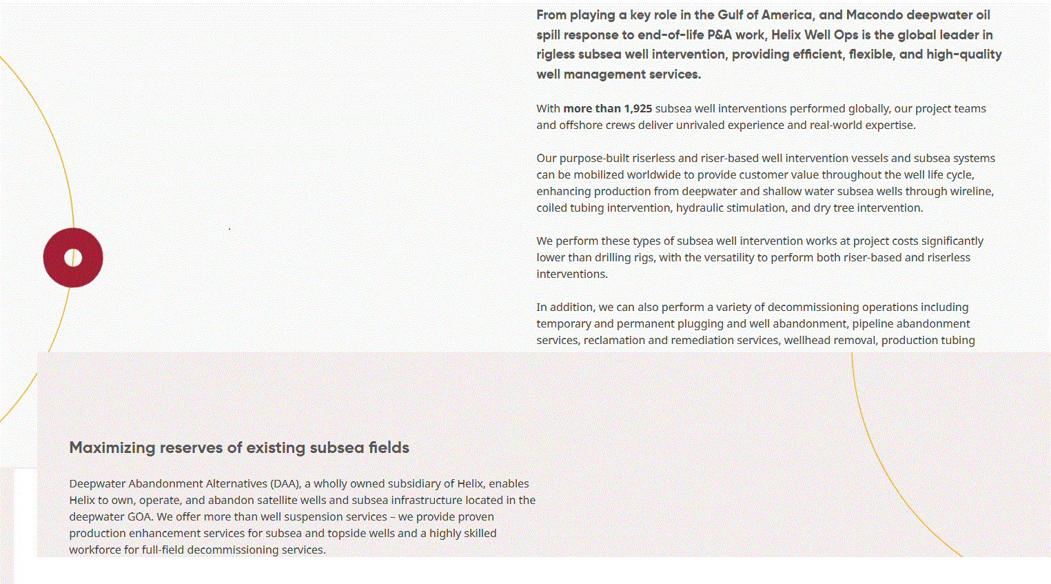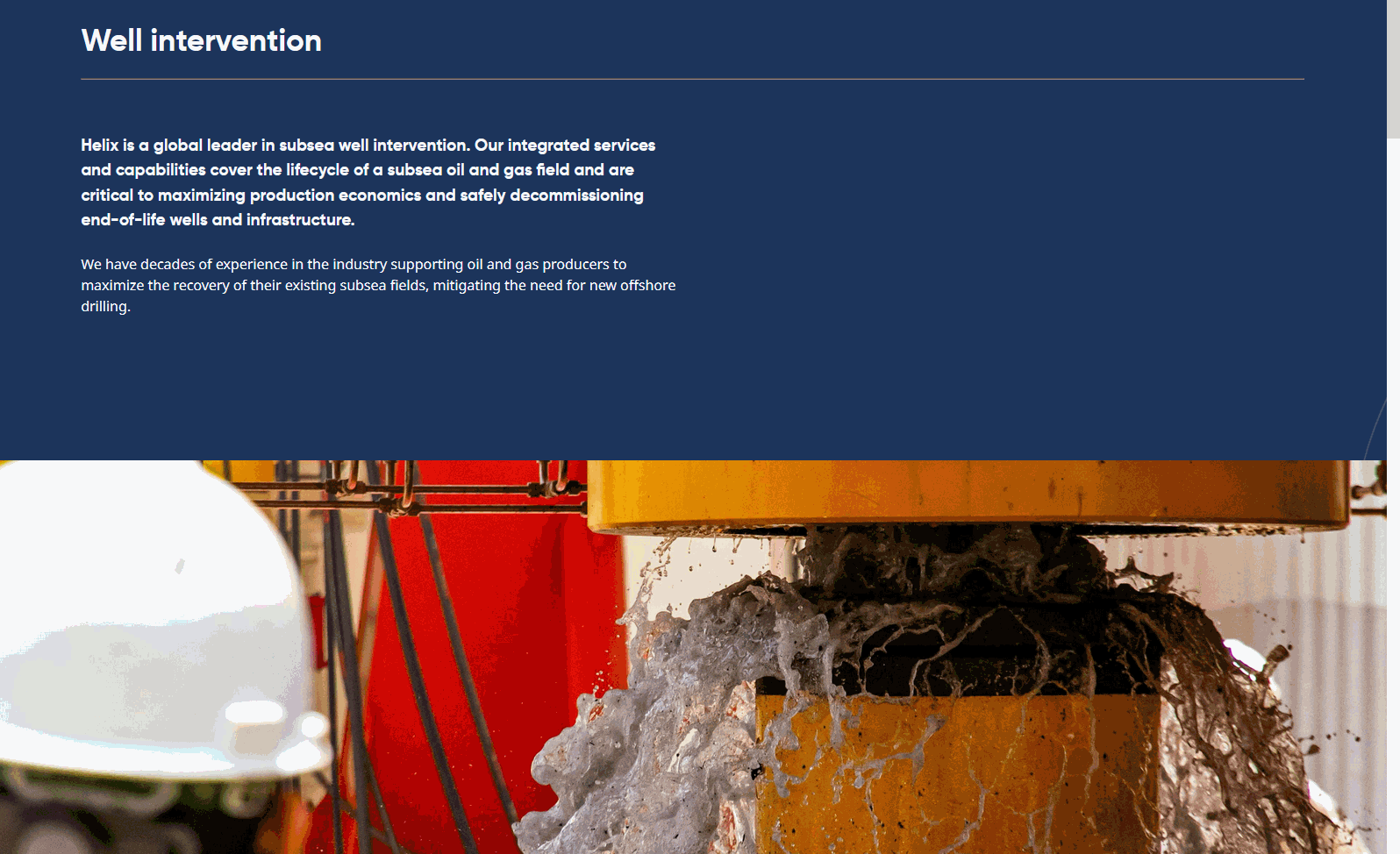 Well Intervention: Helix provides services to access and maintain/extend the productive life of existing offshore wells rather than drilling wholly new wells.