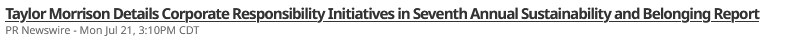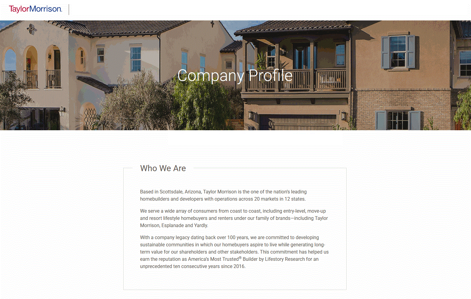 Taylor Morrison Home Corporation is a homebuilder and land developer engaged in building single-family detached and attached homes for first-time buyers, move-up families to luxury and active adult customers. The company operates under the Taylor Morrison brand, Monarch brand and Darling Homes brand. It operates in Arizona, California, Colorado, Florida and Texas. Taylor Morrison Home Corporation is headquartered in Scottsdale, Arizona.
