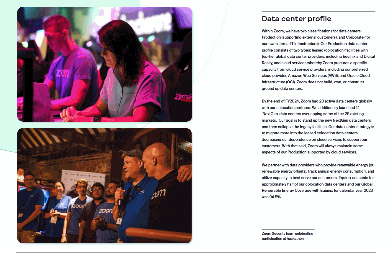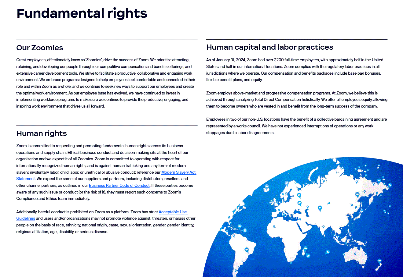 In fiscal year 2024, we continued to invest in AI and focused on three key areas regarding AI innovation: supporting individual productivity, powering better collaboration, and helping customer-facing teams delight their customers. We recently launched Zoom AI Companion, our smart assistant that is designed to empower workers to increase productivity, improve team effectiveness, and enhance skills. Additionally, we introduced our federated approach to AI, which enables us to make Zoom’s AI capabilities accessible and affordable so that more people can incorporate them in their day-to-day workflows. In line with our commitment to responsible AI, Zoom does not use customer audio, video, chat, screen sharing, attachments, or other communications (such as poll results, whiteboard, and reactions) to train Zoom’s or third-party AI models.