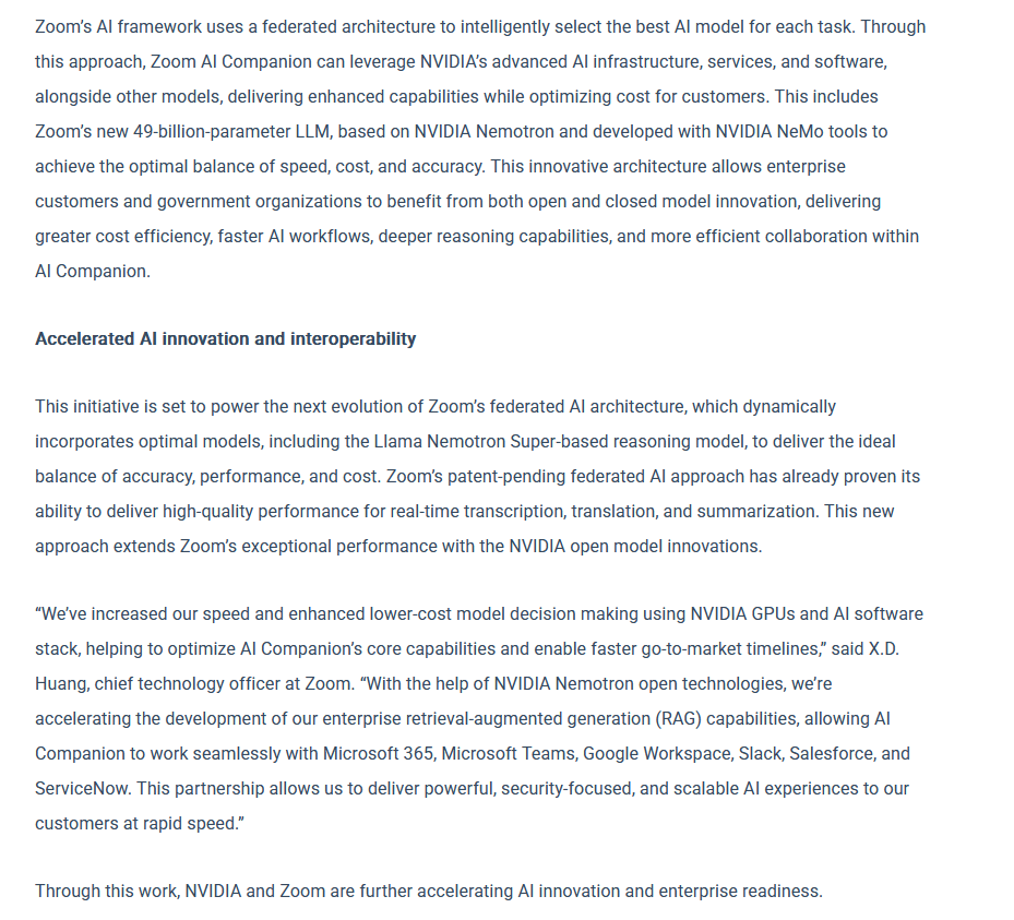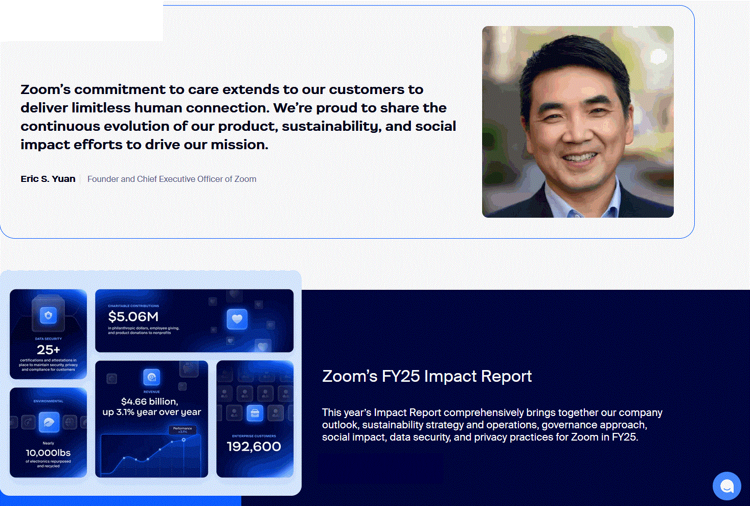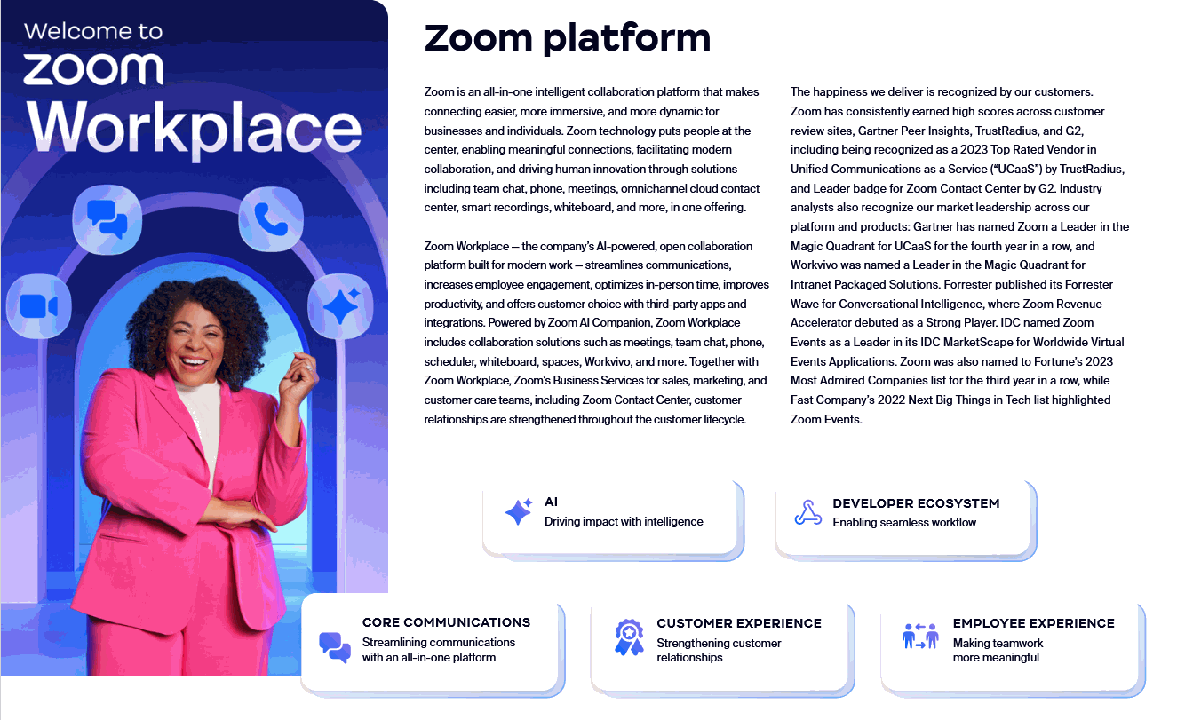 We’re on a mission to reimagine the way we communicate and collaborate in a hybrid working world. The Zoom platform brings employee and customer experience together that people love to use. Flagship products like Zoom Meetings, Zoom Phone, and Zoom Team Chat are among the core products on the platform that are critical to business communication and collaboration needs. We strive to continue building a platform that helps people work smarter, be more engaged with work, and better connect with each other. AI has been core to Zoom’s product DNA over many years, grounded in our conviction that AI can make work more human by strengthening collaboration, productivity, and inclusivity.